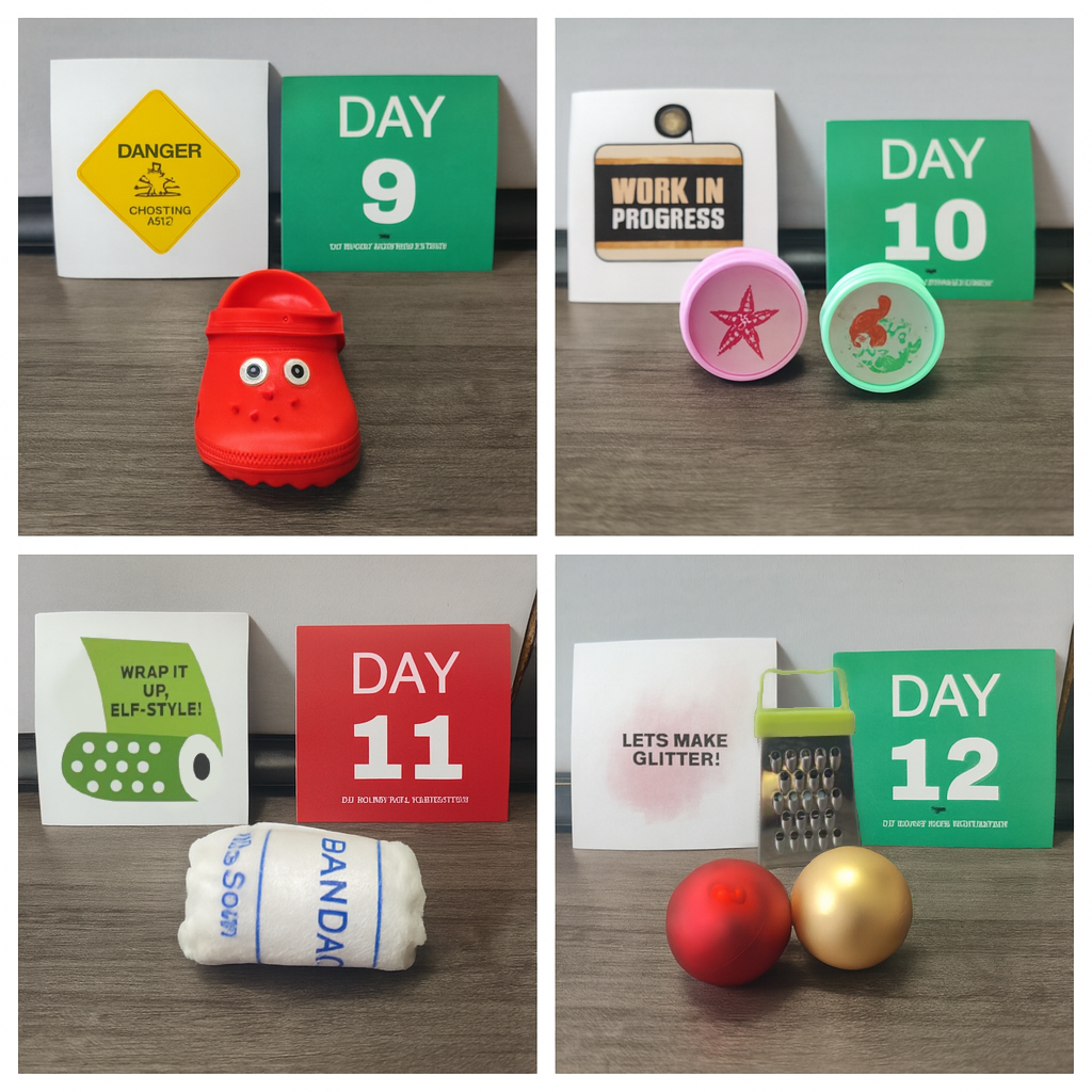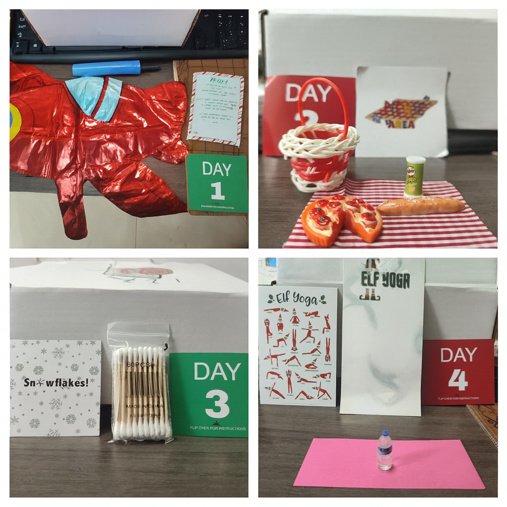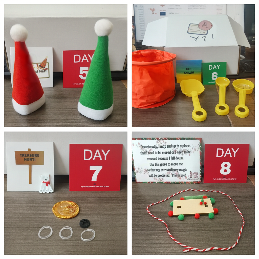 1. Place your elf. Use the included props for the day’s scene.